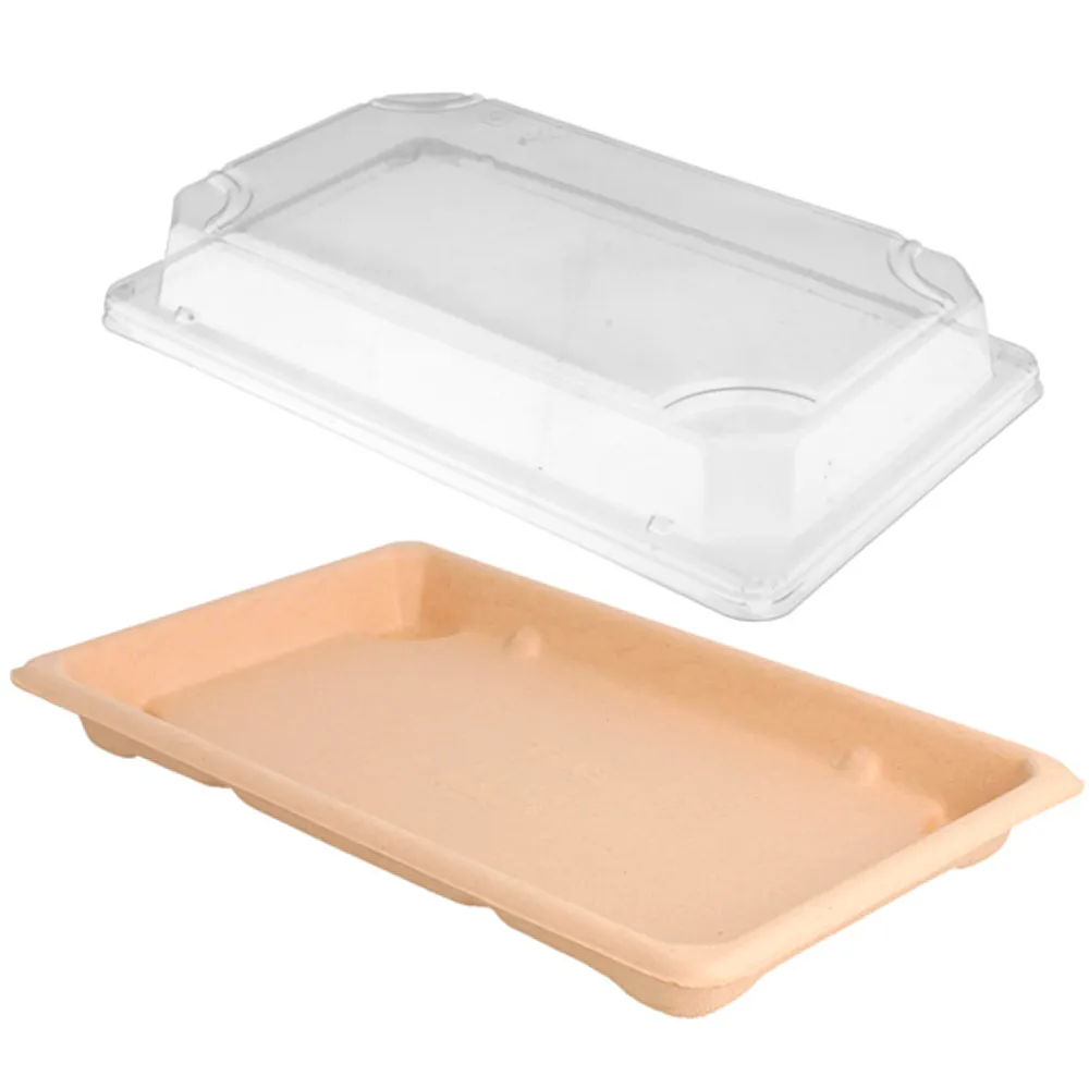 Caixa em bagaço natural com tampa OPS para sushi: embalagem sustentável para restauração moderna