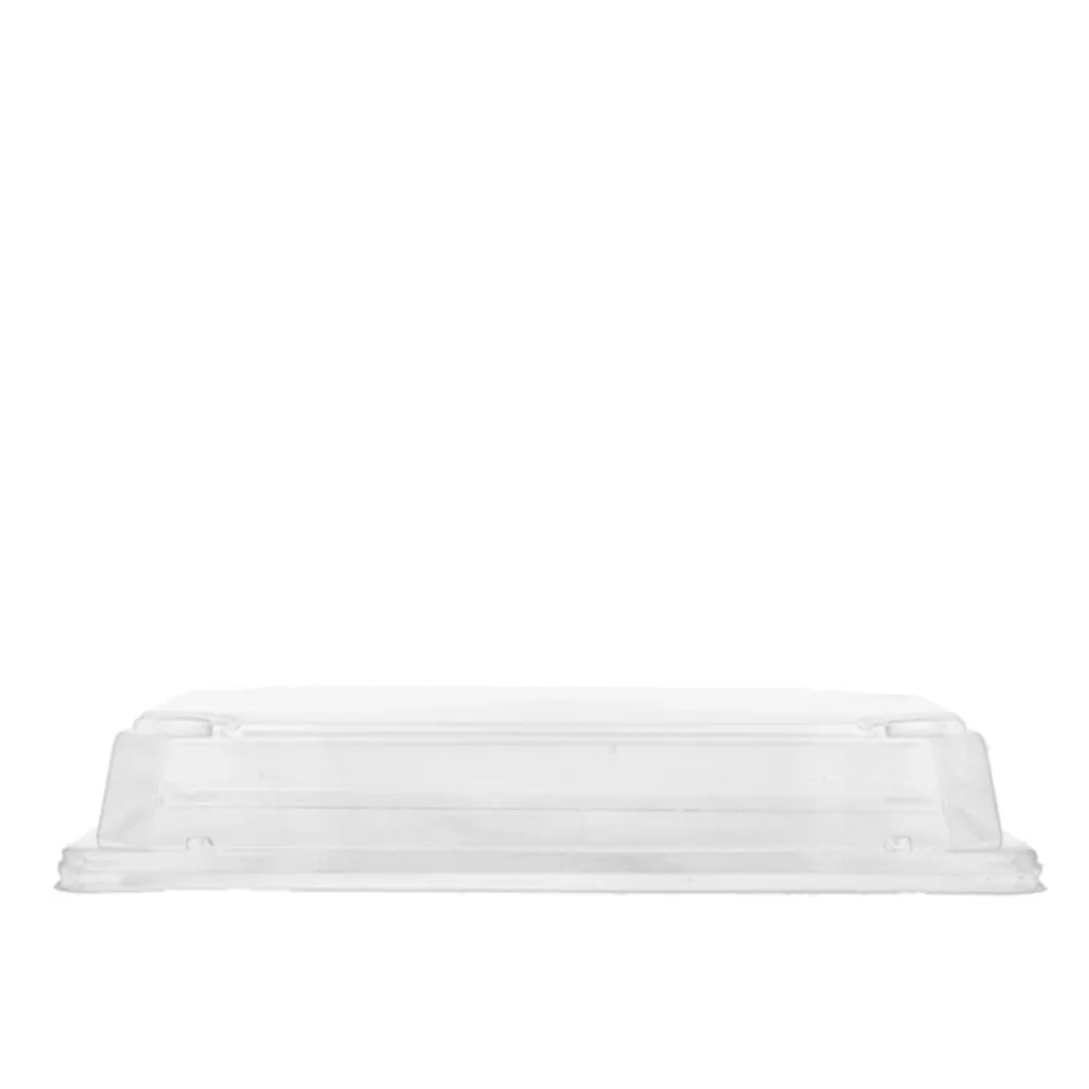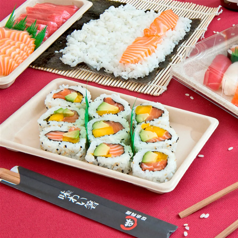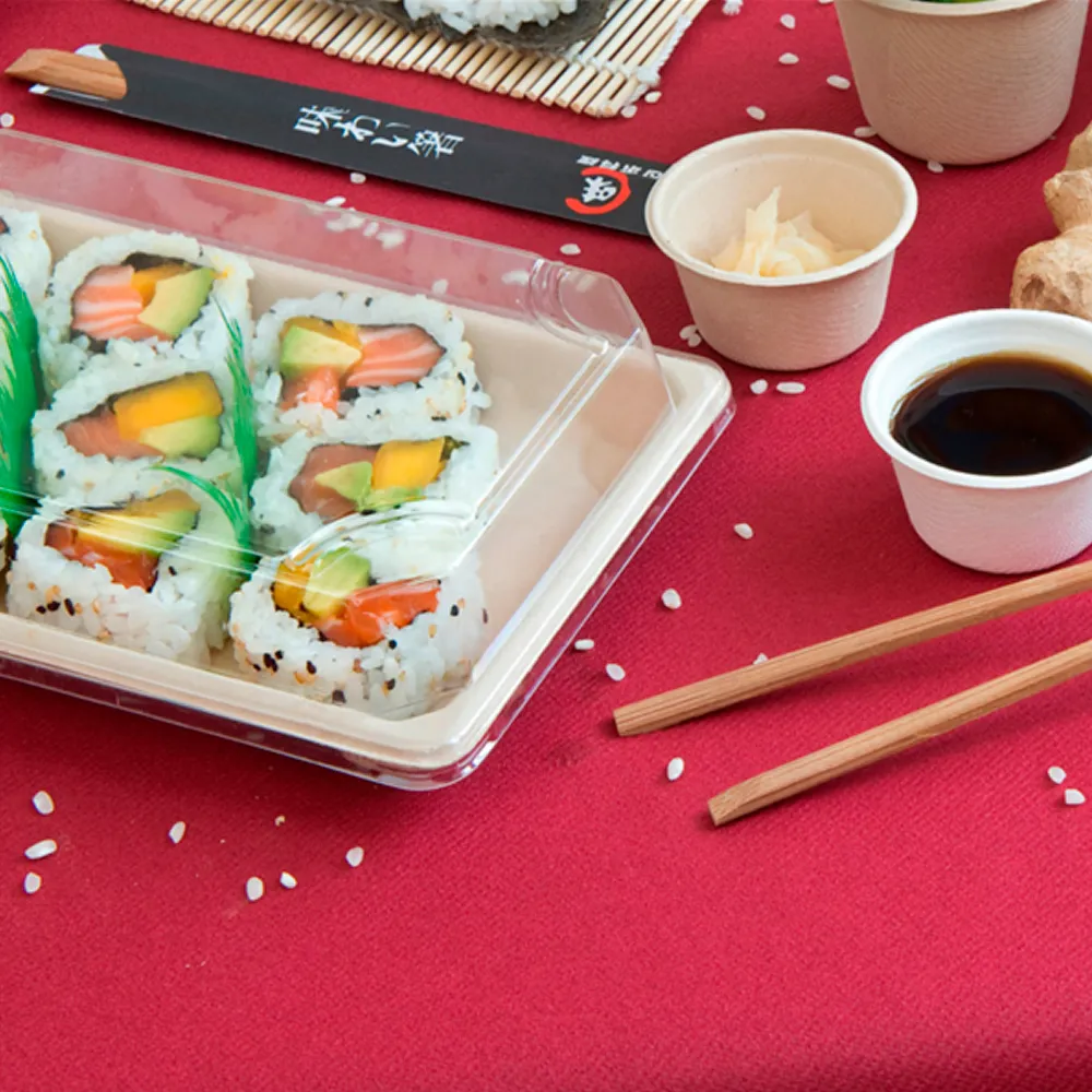 A transparência da tampa permite valorizar a apresentação do sushi, mantendo a frescura e evitando contaminação externa. Esta combinação de bagaço + OPS garante funcionalidade e estética ao mesmo tempo.