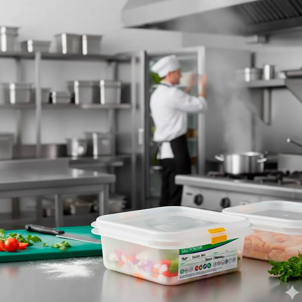 Por seguir o formato Gastronorm, o contentor encaixa em mesas frias, estantes, carrinhos, vitrinas e salamandras de apoio. Deste modo, a equipa organiza os ingredientes por secções e, consequentemente, reduz deslocações desnecessárias. Ao mesmo tempo, as paredes rígidas preservam a forma mesmo com alimentos mais densos, o que facilita a manipulação contínua.