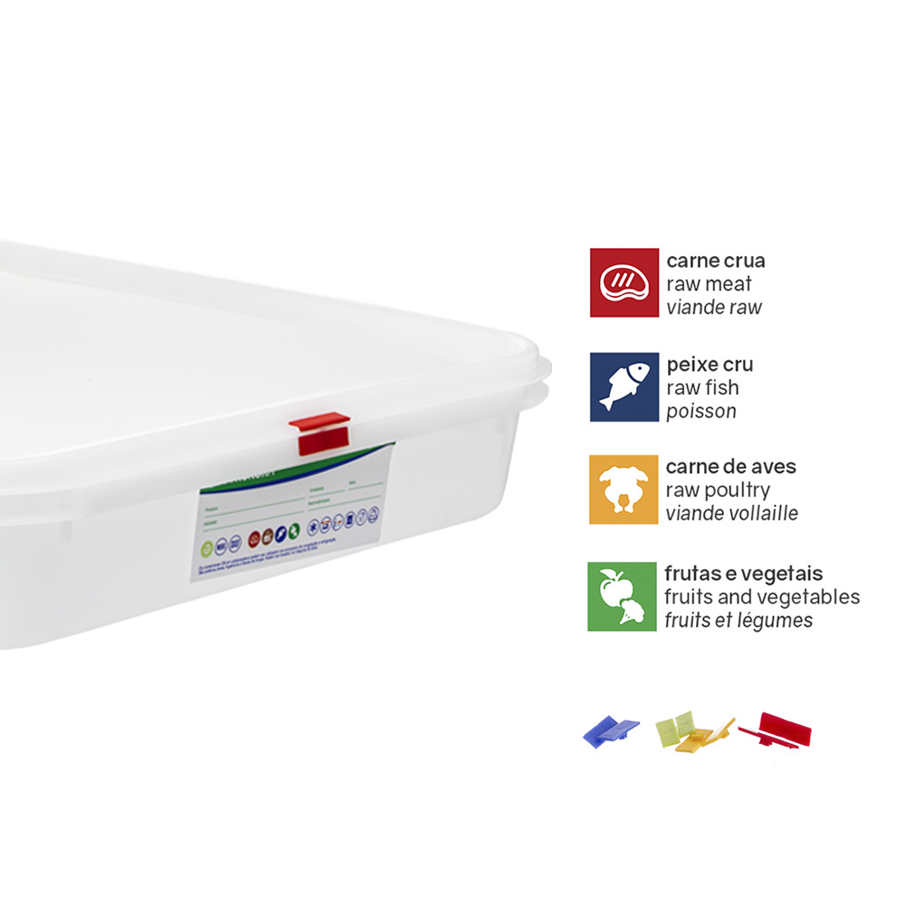 Para maior organização, existe a possibilidade de utilizar acessórios coloridos correspondentes ao código de cores HACCP, otimizando a separação de alimentos e reduzindo riscos de contaminação cruzada. A caixa gastronorm reutilizável é resistente, prática e de fácil limpeza, garantindo longevidade mesmo em ambientes profissionais intensivos.