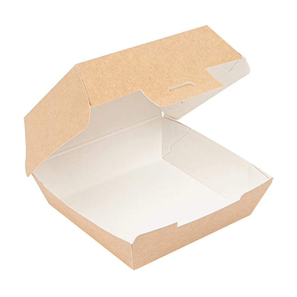Fabricada com matérias-primas adequadas a contacto alimentar, a caixa suporta alimentos quentes e frios. Assim, o hambúrguer permanece suculento, o pão conserva a textura e os acompanhamentos chegam ao destino com ótimo aspeto. A superfície interior ajuda a resistir a óleos e gorduras, enquanto o exterior apresenta cor natural atraente que combina com conceitos artesanais ou gourmet.