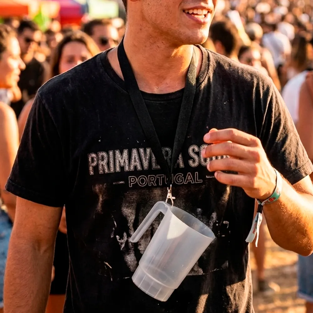 A caneca reutilizável festival foi especialmente desenhada para maximizar a conveniência em eventos. Possui um furo na pega que permite a colocação de fita lanyard, possibilitando pendurá-la ao pescoço e manter as mãos livres durante todo o evento.
