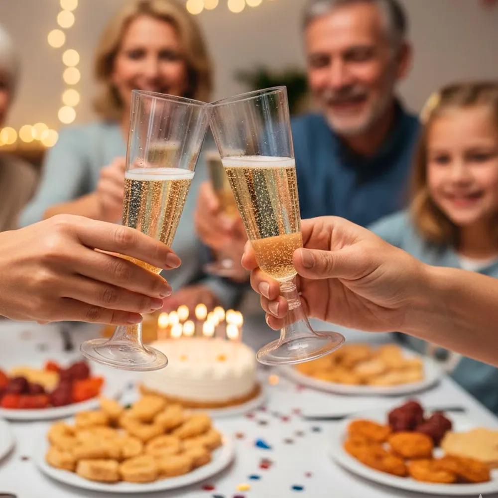 O copo flute em PS transparente adapta-se a rotinas intensas. Seca depressa e volta ao serviço sem demoras. Como é empilhável, ocupa menos espaço e simplifica a logística. Além disso, quando bem cuidado, podes reutilizá-lo até 20 vezes, o que reduz custos e desperdício.
