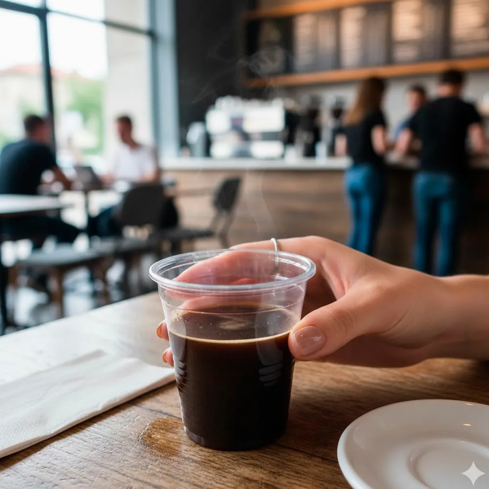 O copo é fabricado com 99% de polipropileno e 1% de masterbatch, garantindo elevada resistência térmica e química. Suporta temperaturas de até 100ºC durante 15 minutos ou 70ºC durante 2 horas, sem deformar nem alterar o sabor ou o aroma das bebidas.