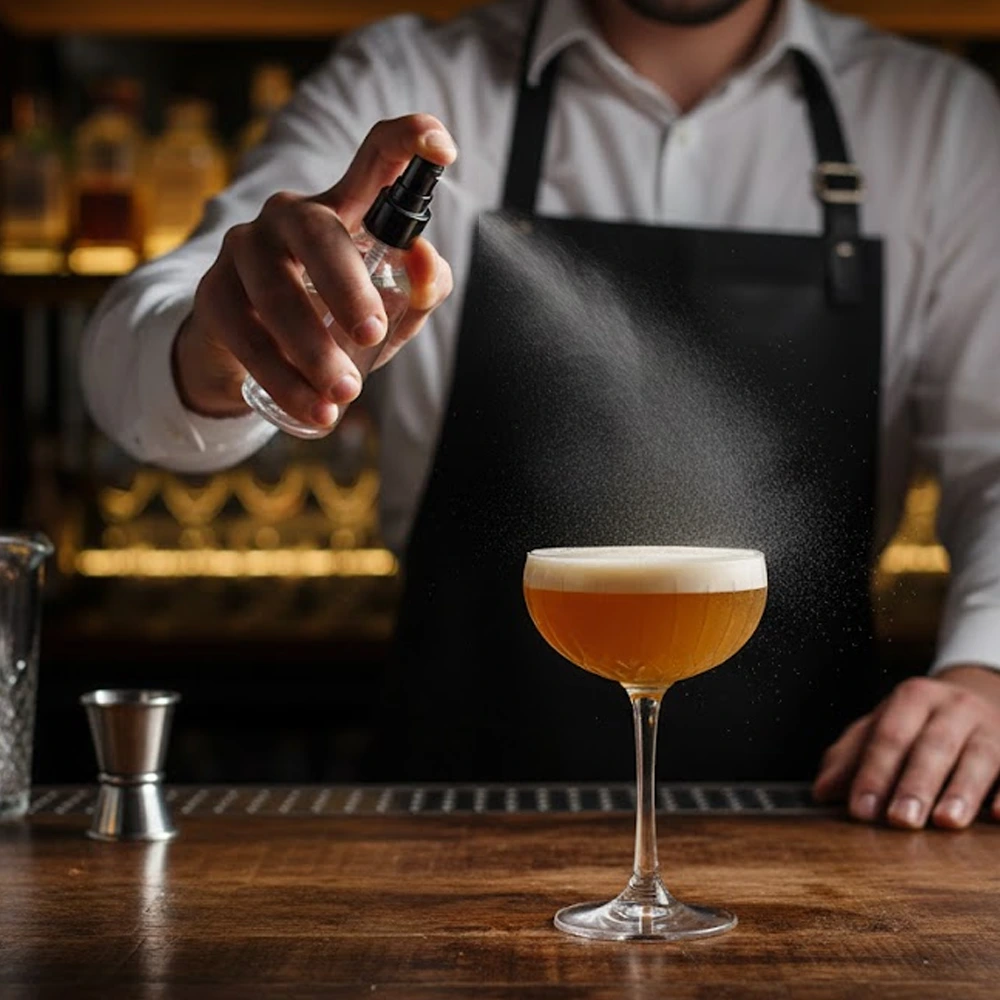 Este recurso é especialmente valorizado em bares modernos que trabalham com cocktails de assinatura, onde a apresentação e o detalhe aromático fazem toda a diferença.