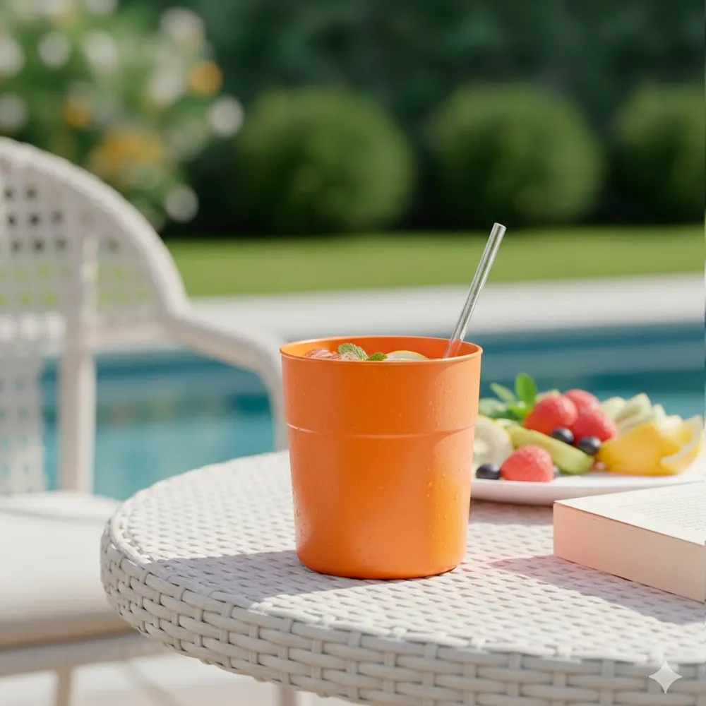 A tonalidade laranja deste copo plástico confere uma atmosfera mais descontraída e alegre, mas também realça o seu sentido de estilo. Por isso, estes copos são adequados para festas, piqueniques ou até para o dia a dia. Ademais, o seu design moderno permite combinar facilmente com outras peças de louça, resultando numa mesa harmoniosa e convidativa.