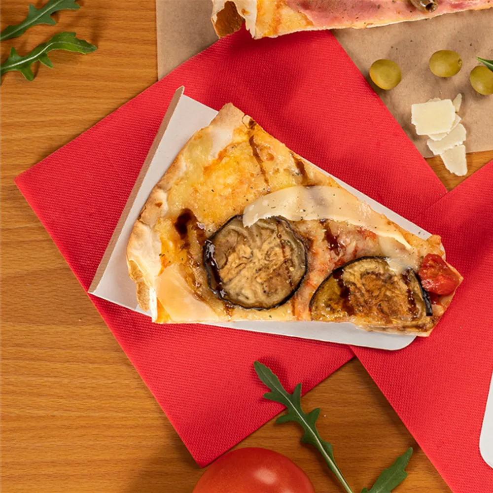 Tamanho: 12×15,4 cm. Material: cartão ondulado nano-micro. Propriedades: elevada rigidez, boa dissipação de vapor, barreira anti-gordura, empilhável, apto para contacto alimentar. Uso: suporte para fatia de pizza e snacks quentes.