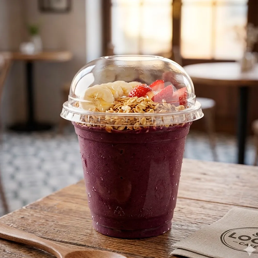 Para além disso, a forma alta da tampa contribui para um visual moderno e distinto. Se deseja destacar a qualidade e a frescura dos seus produtos, a transparência do copo PET funciona como uma montra, permitindo que os clientes observem o que estão prestes a consumir. Esta caraterística atrai sobretudo quem valoriza a autenticidade dos ingredientes, reforçando a confiança e a satisfação durante a compra.