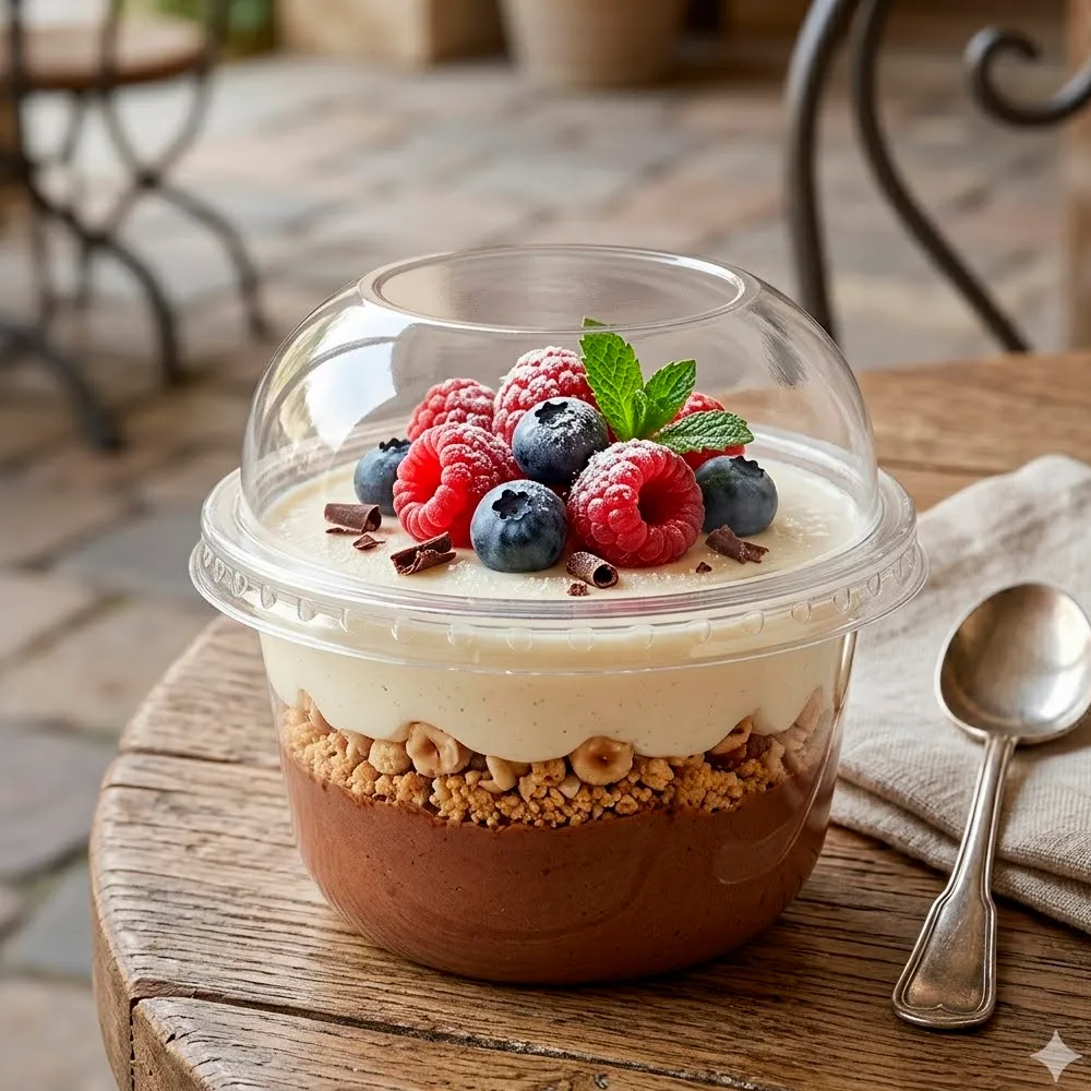 Com 230ml de capacidade, esta taça adapta-se a diferentes tipos de sobremesas, como mousses, gelatinas, iogurtes, saladas de frutas e tiramisu. Além disso, a tampa em PET sem furo mantém os alimentos protegidos, evitando derrames e garantindo uma melhor conservação.