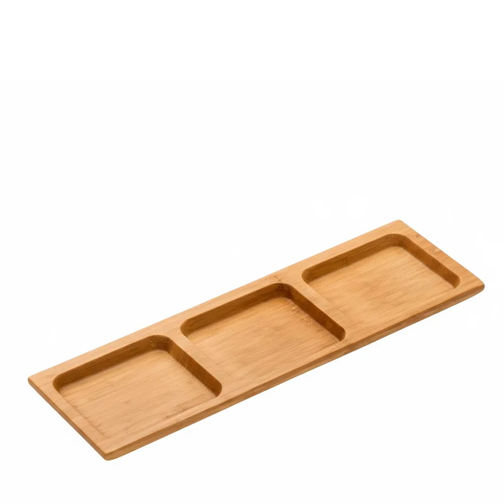 O bambu é um material biodegradável, leve, resistente e reutilizável, tornando esta bandeja uma excelente alternativa aos plásticos descartáveis. O seu formato com três compartimentos separados facilita a apresentação de diferentes alimentos sem misturar sabores ou texturas.